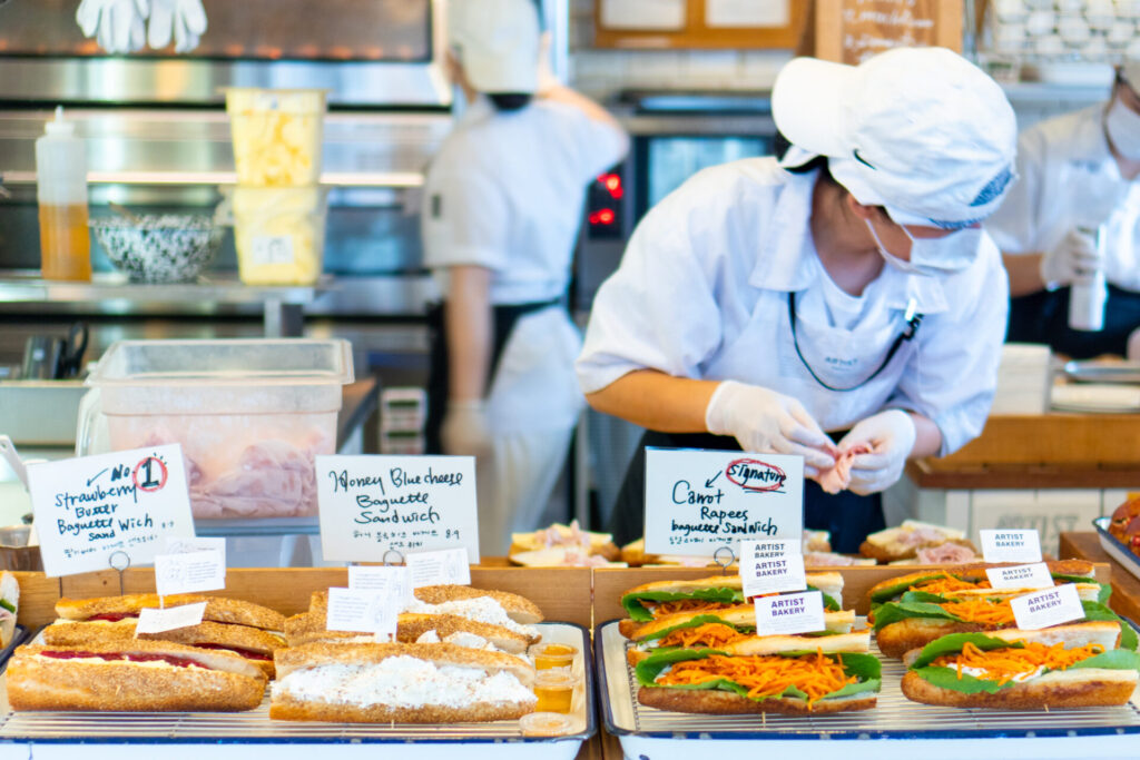 ロンドンベーグルミュージアムがその名の通りベーグル専門店なのに対し、こちらのアーティストベーカリーは塩バターパンが主役。生地の成形の仕方は違いますが、パンに挟む具材の組み合わせなどは、驚くほどよく似ていました。