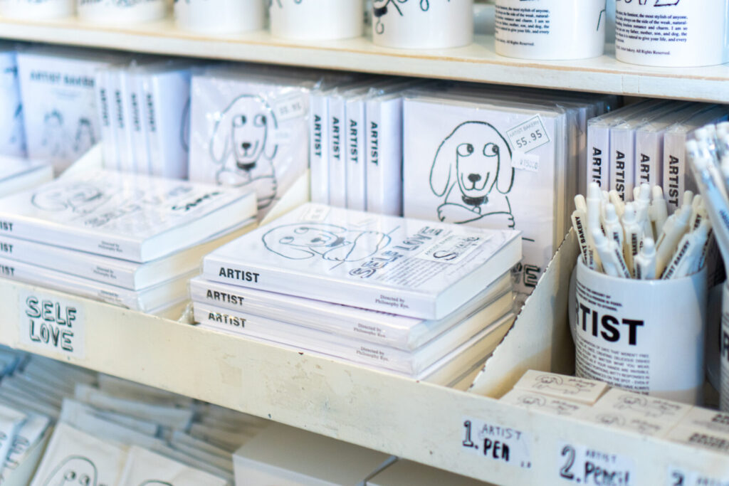 ロンドンベーグルミュージアムのキャラクターが馬だったのに対し、アーティストベーカリーはダックスフンドのような可愛い犬がキャラクター。その犬がマグカップや様々なグッズになっていて、ファンにはたまらないでしょうね。