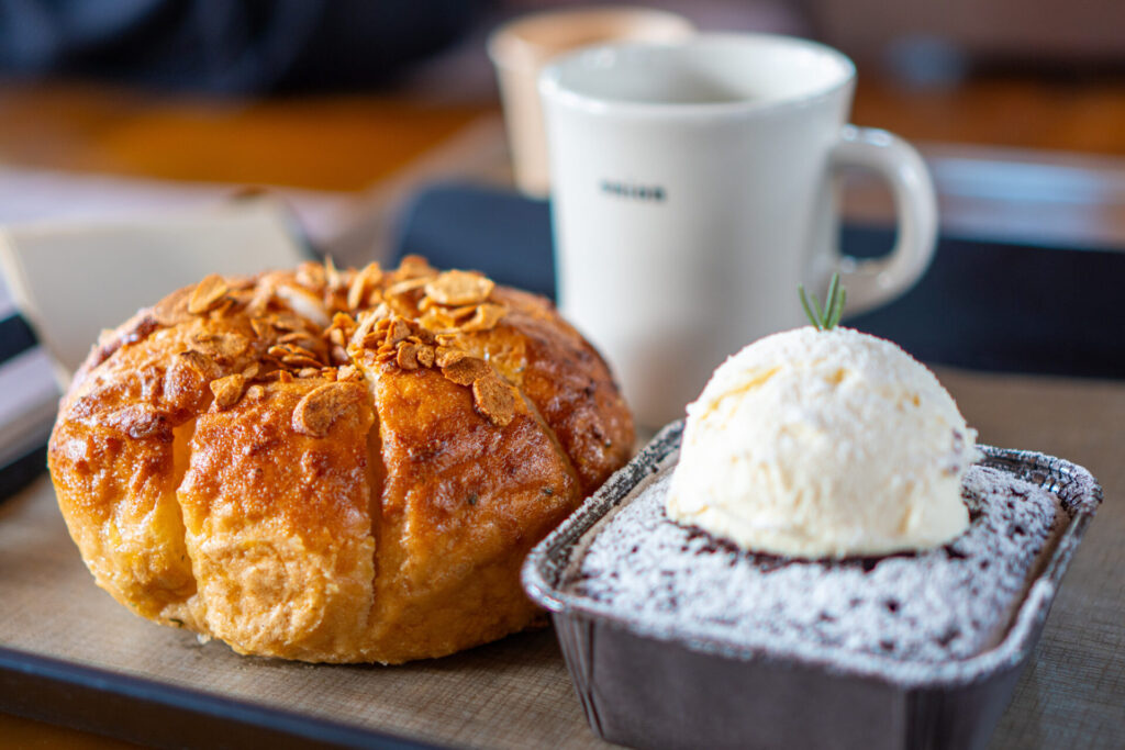 私たちが食べたパンの一つは、ブラウニーのような濃厚なパンの上に、地球儀のようにこんもりとクリームチーズが乗っているものでした。見た目のインパクトもすごいですが、味もかなり濃厚!