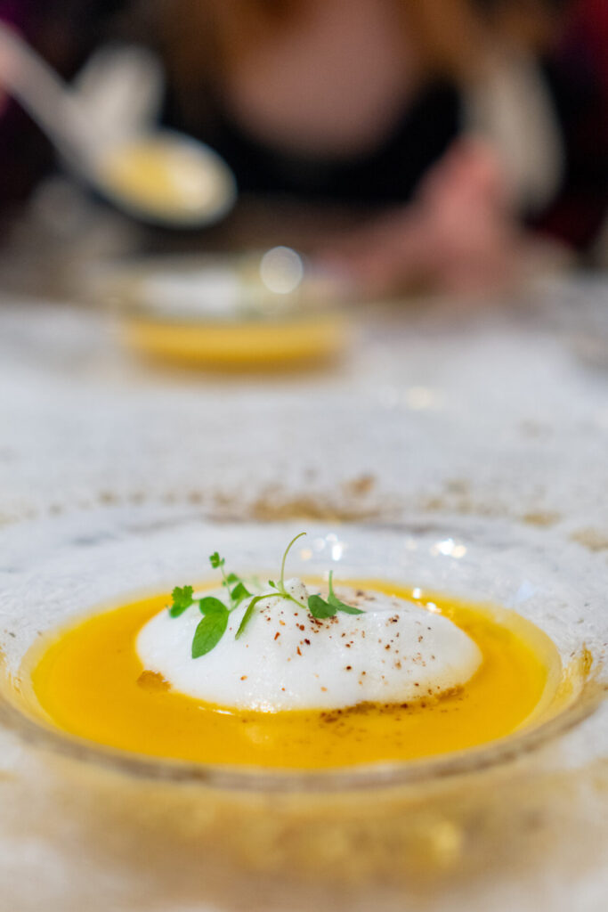 カボチャのスープ自体も、素材の自然な甘みを生かした優しい味わいで絶品だったのですが、そこにラ・フランスの芳醇な香りと風味が加わることで、味わいが立体的になるというか、別の料理に進化するような感覚でした。